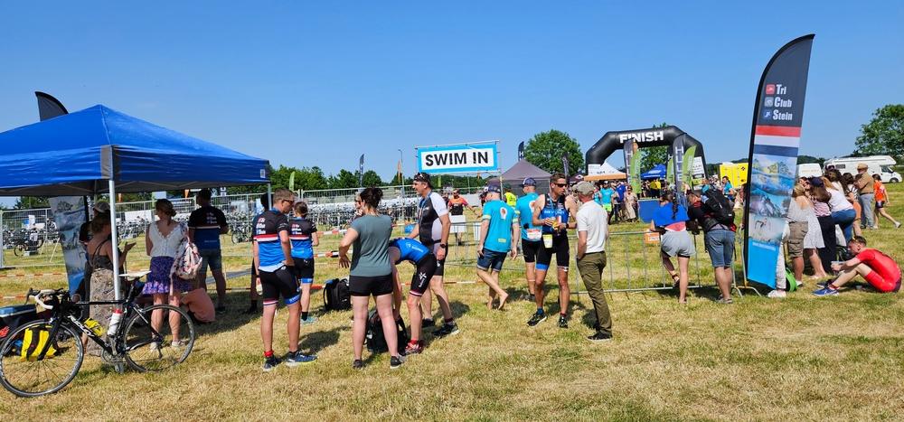 Vervolgens richting Eijsden waar Dolf en Rob hun wisselzone al aan het inrichten waren. We spraken nog even over de verwachtingen van vandaag en de verdere plannen dit seizoen waarna we ons richting de zwemstart begaven. De watertemperatuur was aangenaam en het zwemmen ging vrij aardig. In de middenmoot kwam ik het water uit. Voor mijn zwemkunsten prima. Na de gebruikelijke worsteling met het wetsuit begon ik aan het fietsonderdeel. Dolf en Rob hadden beide de eerste meters er al op zitten.